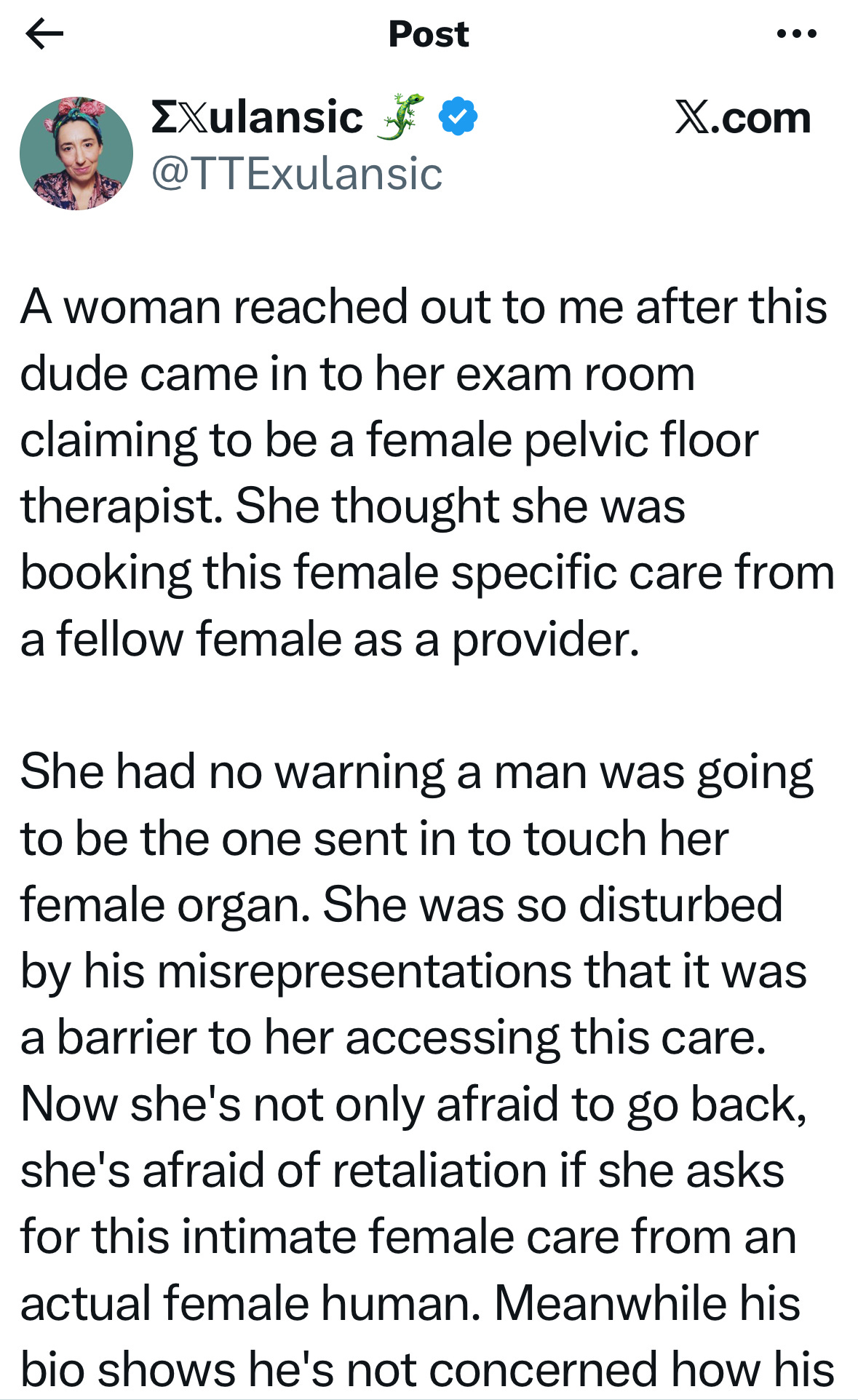 The woman who contacted Exulansic was seeking support after expecting a female clinician at the practice she chose specifically because the very-pink website signalled “woman” to her. However, into her dimly lit treatment room, walked a masked, trans-identified male pelvic health physiotherapist.
